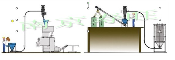 負壓送氣力輸送系統一般用羅茨真空泵或真空發生器動力源,抽吸系統內的空氣,輸送管內形成低于大氣壓的負壓,進風口形成物料與氣體的兩相流,進入管道,在一定的流速下,吸送到終點的料氣分離設備,物料在重力或離心力的作用下分離出來進入料倉,氣體經羅茨真空泵或離心機排入大氣。